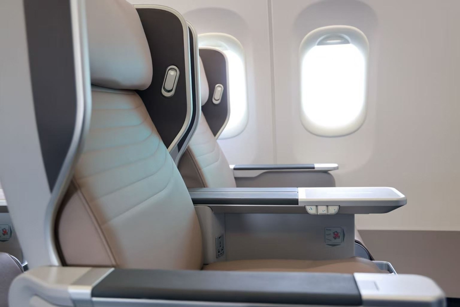 南航新一代客舱内饰以“国风清雅、沐光而行”为设计主题,通过明快柔和的色调搭配与新型环保工艺,将中式审美元素与现代简约风格完美融合,展现东方之美与当代质感。公务舱座椅采用浅灰色真皮头枕与棕灰色真皮主体,辅以精致的缝线与柔和的皮质光感。明珠经济舱座椅选用了米灰色羊毛织物作为主材质,搭配真皮条纹装饰,既有柔软亲肤的触感,又保持了简约大气的视觉效果。经济舱座椅采用天空蓝羊毛织物与浅米色侧边装饰,整体色调清新明快,营造轻盈、放松的乘坐氛围,缓解长途飞行的视觉疲劳,也传递出南航“让更多人乐享美好飞行”的真诚关怀。未来,南航新一代客舱内饰将遵循“统一升级、精准适配”的原则,分阶段推进实施。